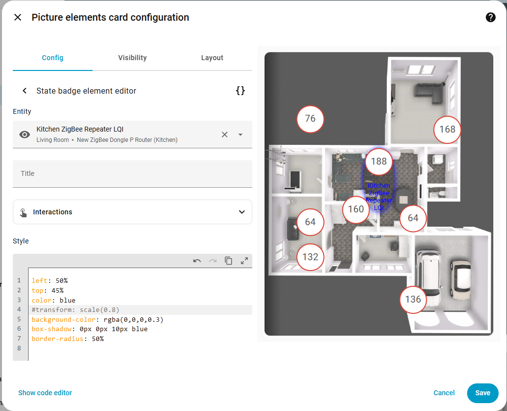 I want to keep an eye on my LQI values for my dedicated Zigbee repeaters around the house and have used the Picture Elements card overlayed with LQI entities. This works in its most basic form but I want it to be a little prettier and update it with the following: