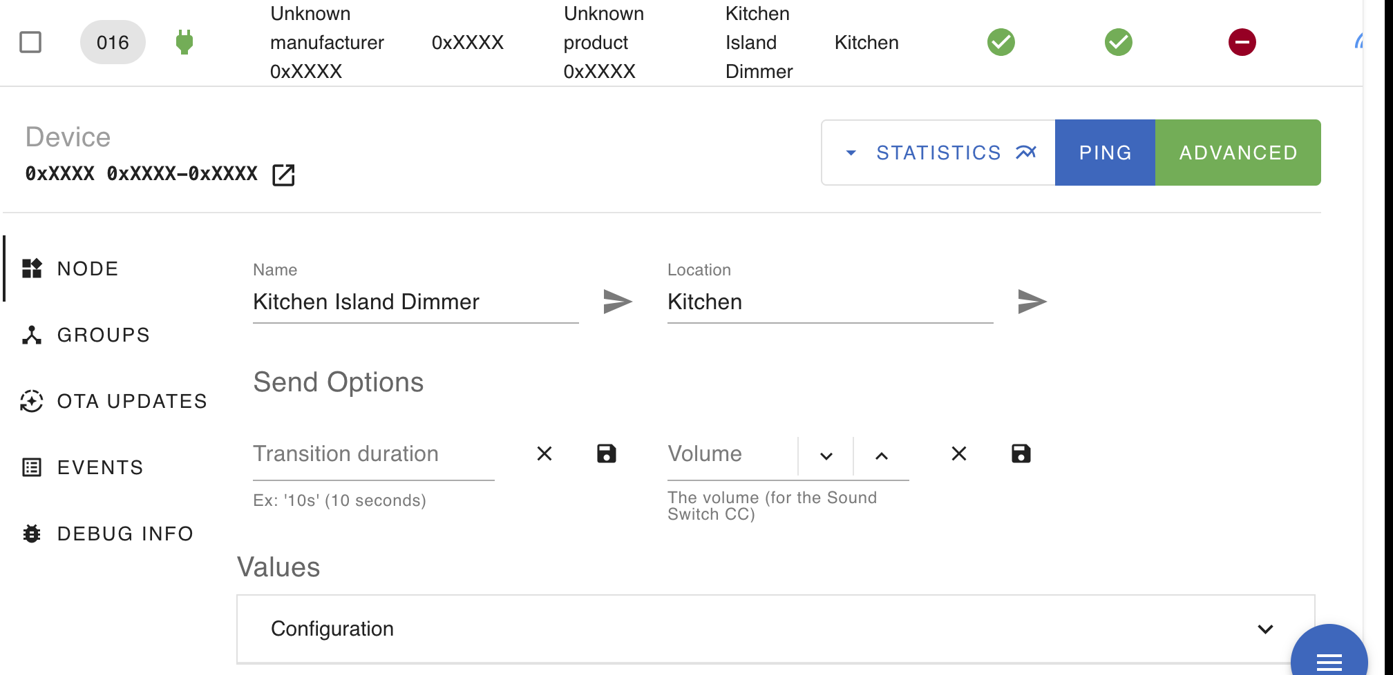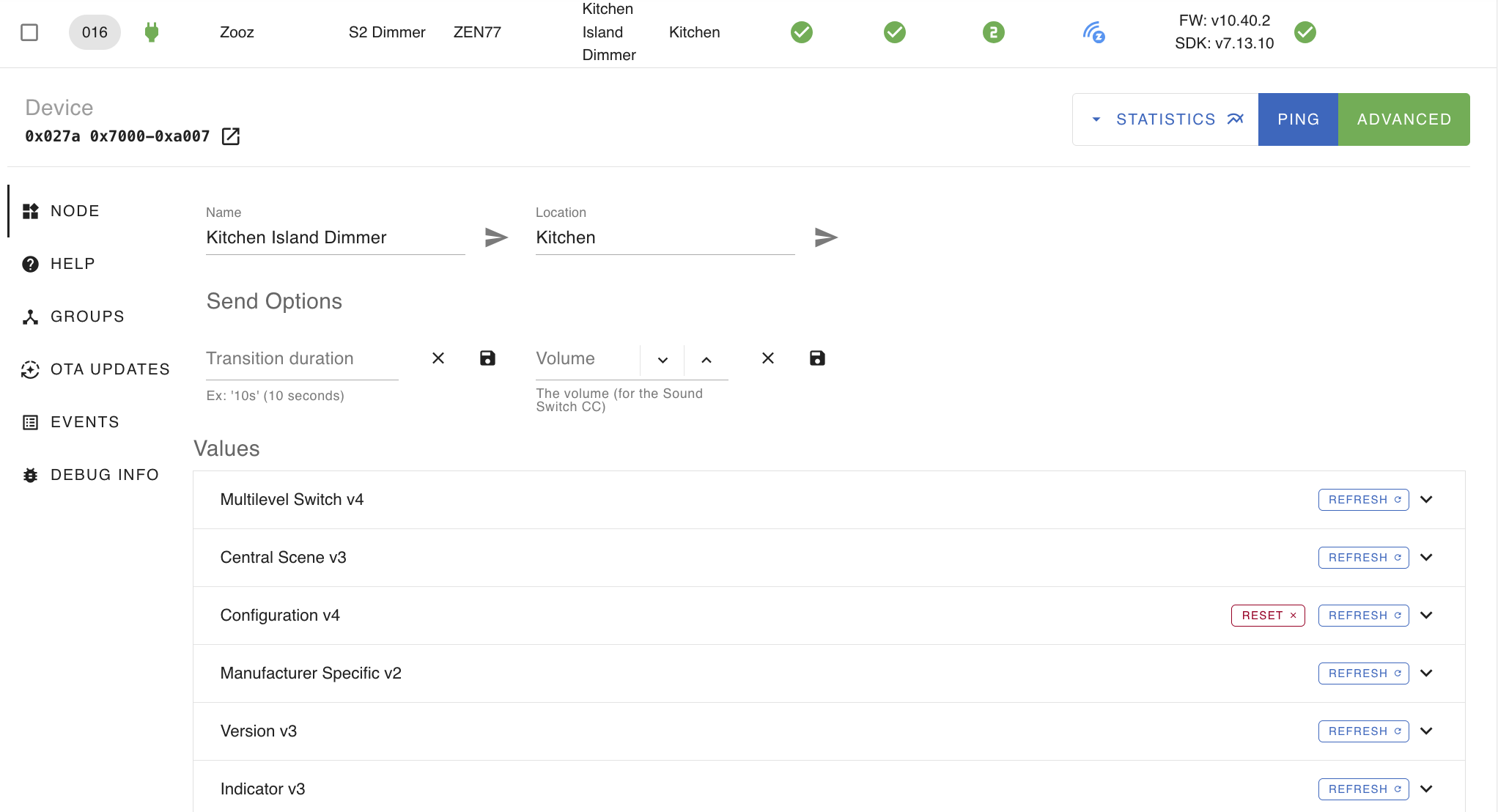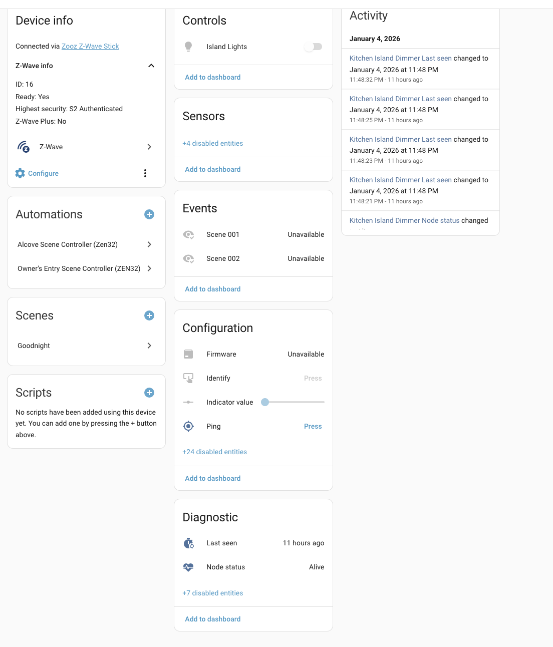 Yesterday, I discovered that a kitchen island light dimmer (Zooz Zen77) seems to have failed or otherwise just stopped communicating with my HA hub. Here are a couple of screenshots to show you what I am seeing. The switch does work manually to turn the light on/off.