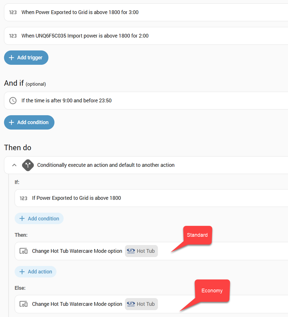 As soon as the main automation kicks in, when there is 1800w or more of grid export, the automation won’t be satisfied any more (as the spa will; pull about 3500W, so if I create a second script to turn the spa back to economy mode once the grid export drops to below, say 1500w, it’ll activate immediately.