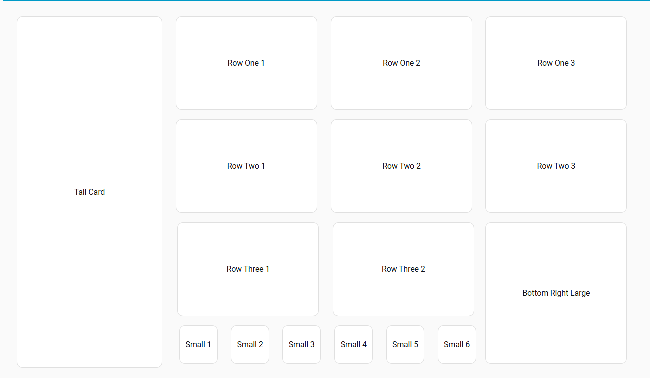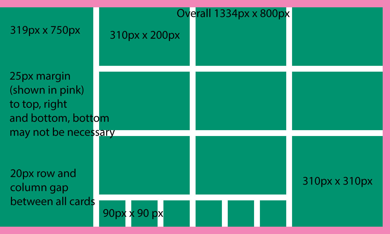 My current full yaml is below but I can’t seem to get a consistent 20px gap between cards and 25px gap on the outside. how can i create a grid exactly as my image (I’ve not even attempted the 310 x 310 card yet)?