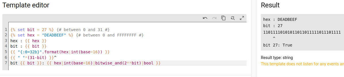 bit {{ bit }}: {{ hex|int(base=16)|bitwise_and(2**bit)|bool }}