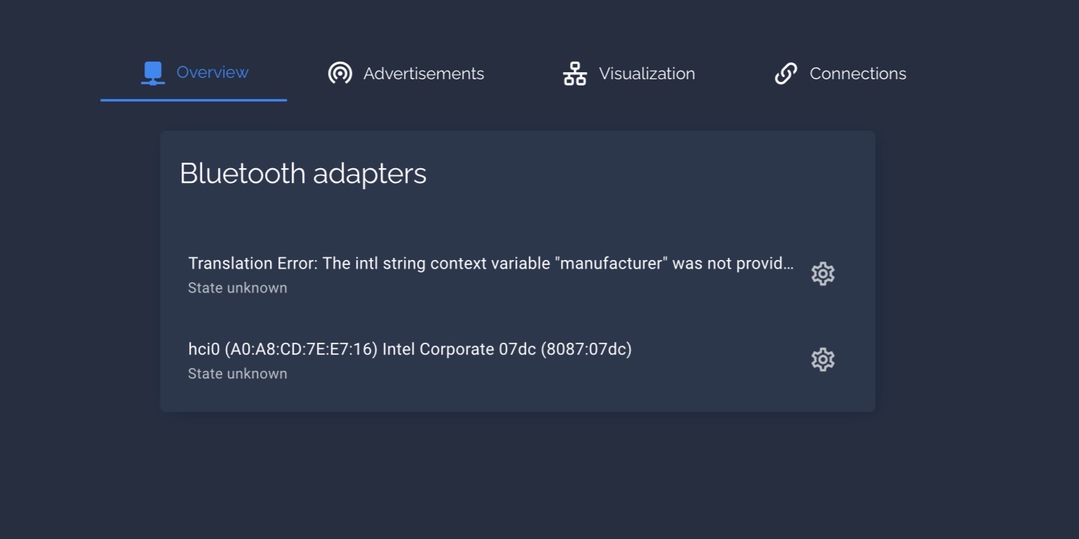 Problem: I run HA in a VM that does NOT have Bluetooth enabled/passed through anymore (it did several years ago). My configuration.yaml does not include Bluetooth either. Yet the Settings are still displayed, with BT adapter missing and showing an error.