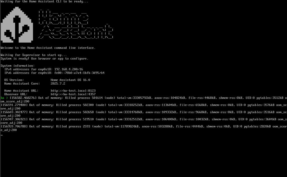 Tested with Lower RAM Allocation (4 GB). HA booted but the VM became unresponsive with immediate OOM errors.