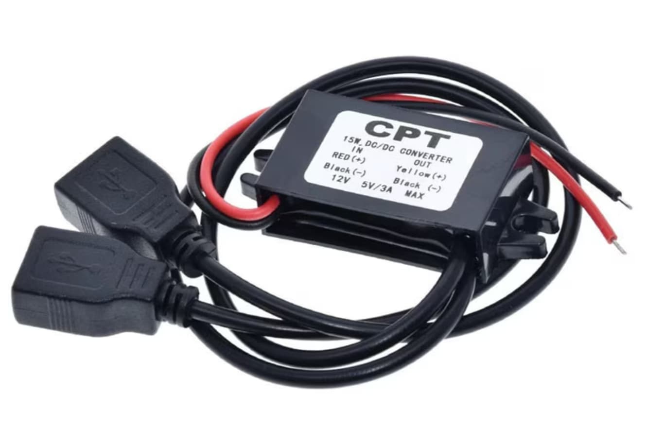 I managed to find a 12V-to-5V, 15W automotive buck converter in my “recyclable stockpile” (read: junk I haven’t thrown away because I might need it someday) - and the ‘automotive’ part is crucial in this build because it is fully encapsulated in resin so it protects the rest of the sistem from shorts and it has some extra protections required in automotive industry (Over Voltage, Over Current, Over Temperature)