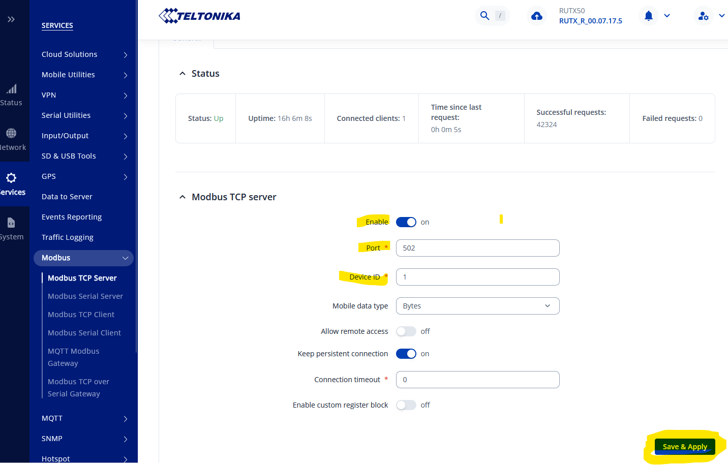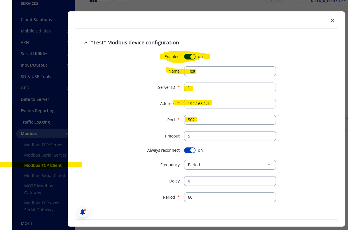 First step is to enable Modbus in the router, taking note of the Port and Device ID parameters