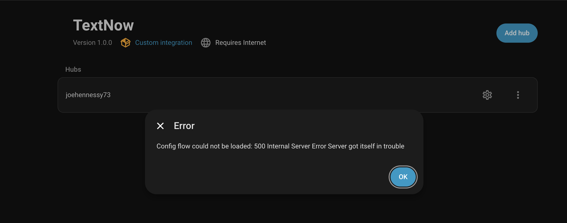 I have tried a dozen times, and double checked I was doing it correctly, to configure the link and it will not work. I’m getting the error “Config flow could not be loaded: 500 Internal Server Error Server got itself in trouble” when trying to access the settings/cog wheel.