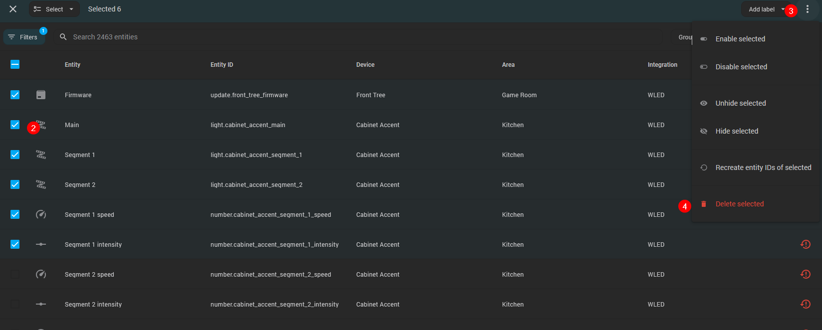 You don’t, after some time they will be deletable. The integration has to learn that the upstream device is no longer sending that info over. It takes a bit for integrations to understand that. Typically a restart or 2. When you have that