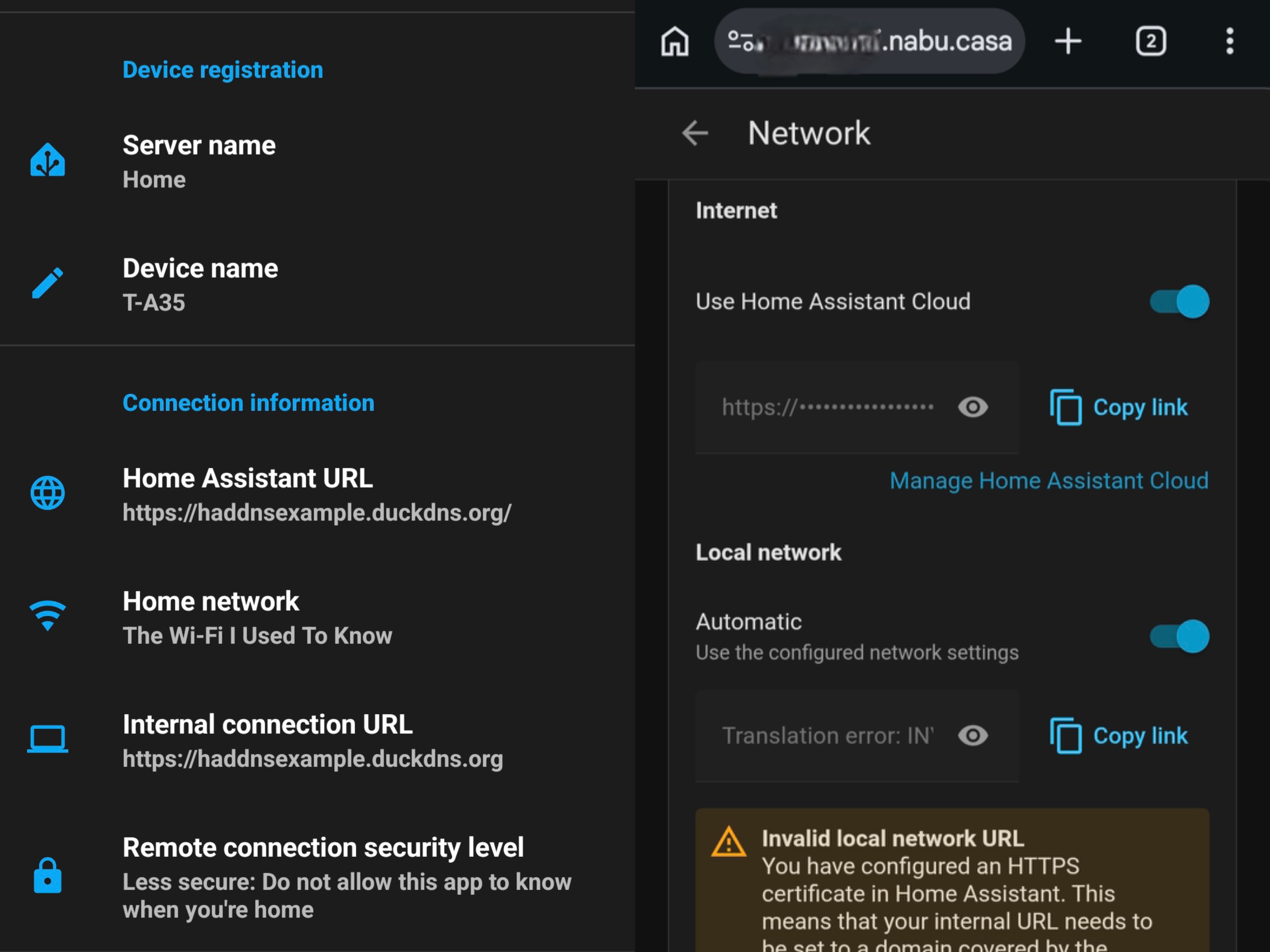 I flashed my HAOS onto an laptop I was no longer using. I’m using HA companion app for Android to connect. I signed up for the free month of Nabu Casa’s Home Assistant Cloud service just a few days short of a month ago. Since then, in an attempt to fin an alternative solution that would enable me to be able to connect to my HA instance will away from home. I downloaded and set up both Duck DNS and WireGuard with/on my HA. Which worked fine for a few weeks until I had to leave the laptop I’m running HAOS on unplugged for long enough that the the old battery died inside. By the time I was able to plug my laptop back in and turn it on, HA had rebooted and I lost my ability to access it. I followed some instructions from Google Gemini on how to reconnect. Which I was thankfully able to. I’m learning more and more that it’s unwise to just blindly trust LLM’s advice. As it had told me to use duck DNS domain name (https://haddnsexample.duckdns.org) to fill in both “Use Home Assistant Cloud” and “Local Network” section under Network > System > Settings in my HA instance. As well as “Home Assistant URL” and “Internal Connection URL” under Connection Information > Server > Services & Devices > Companion App in my HA app. I had a gut feeling that this didn’t make sense. However, I just went with it because it worked at the time. I also set up WireGuard in HA that am using with my phone. Google Gemini’s instructions seemed to get the job done there as well. However, when I was unable to connect to my HA instance after reboot. Nothing I had set up was allowing me to regain access. Now that I’ve explained why I’m asking the question. It’s finally time for the question itself.