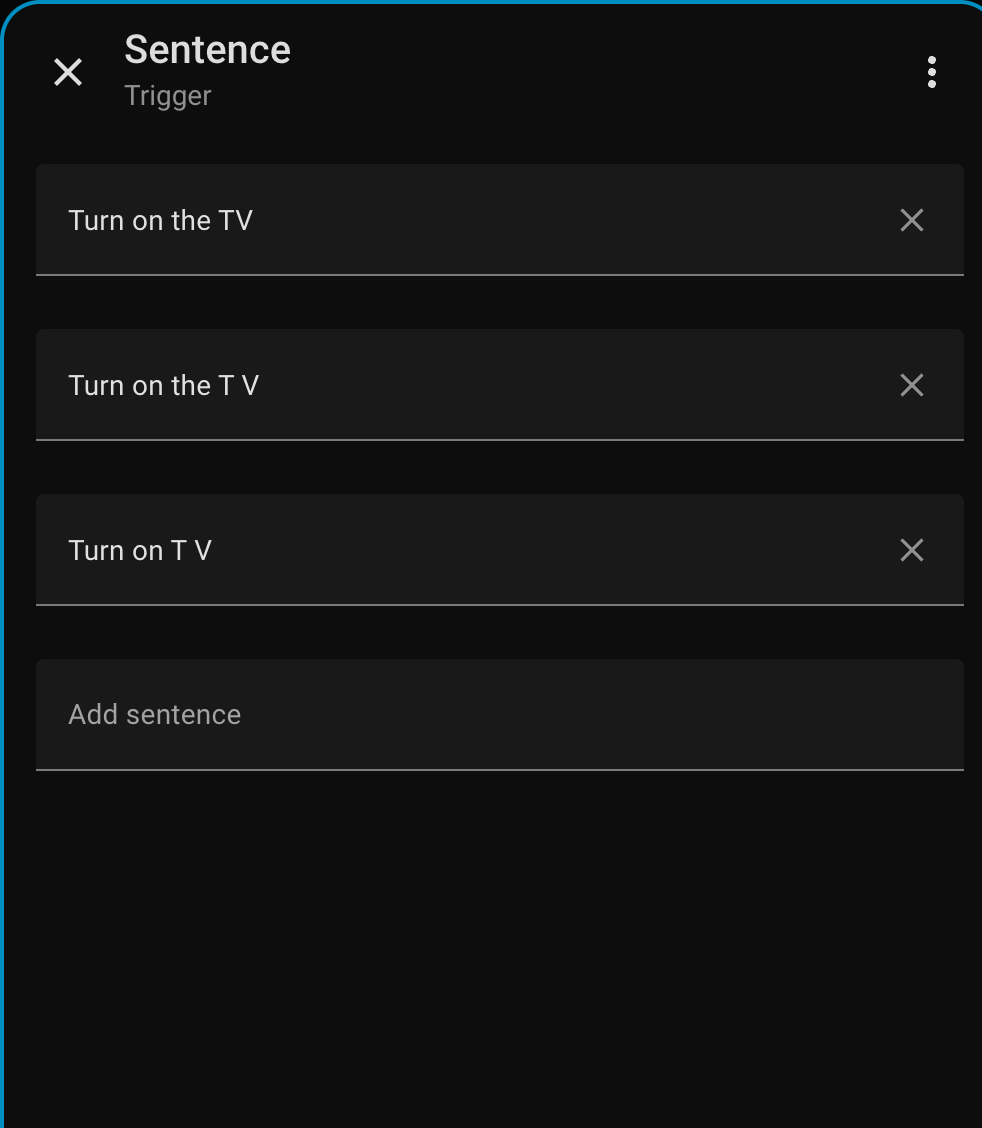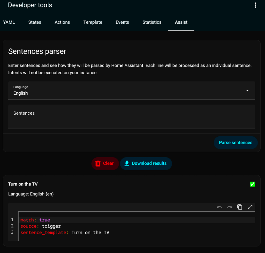 I am currently using the faster-whisper STT provider and poper for TTS. Typing “Turn on the TV” to the sentence parser in Dev tools matches to the trigger:
