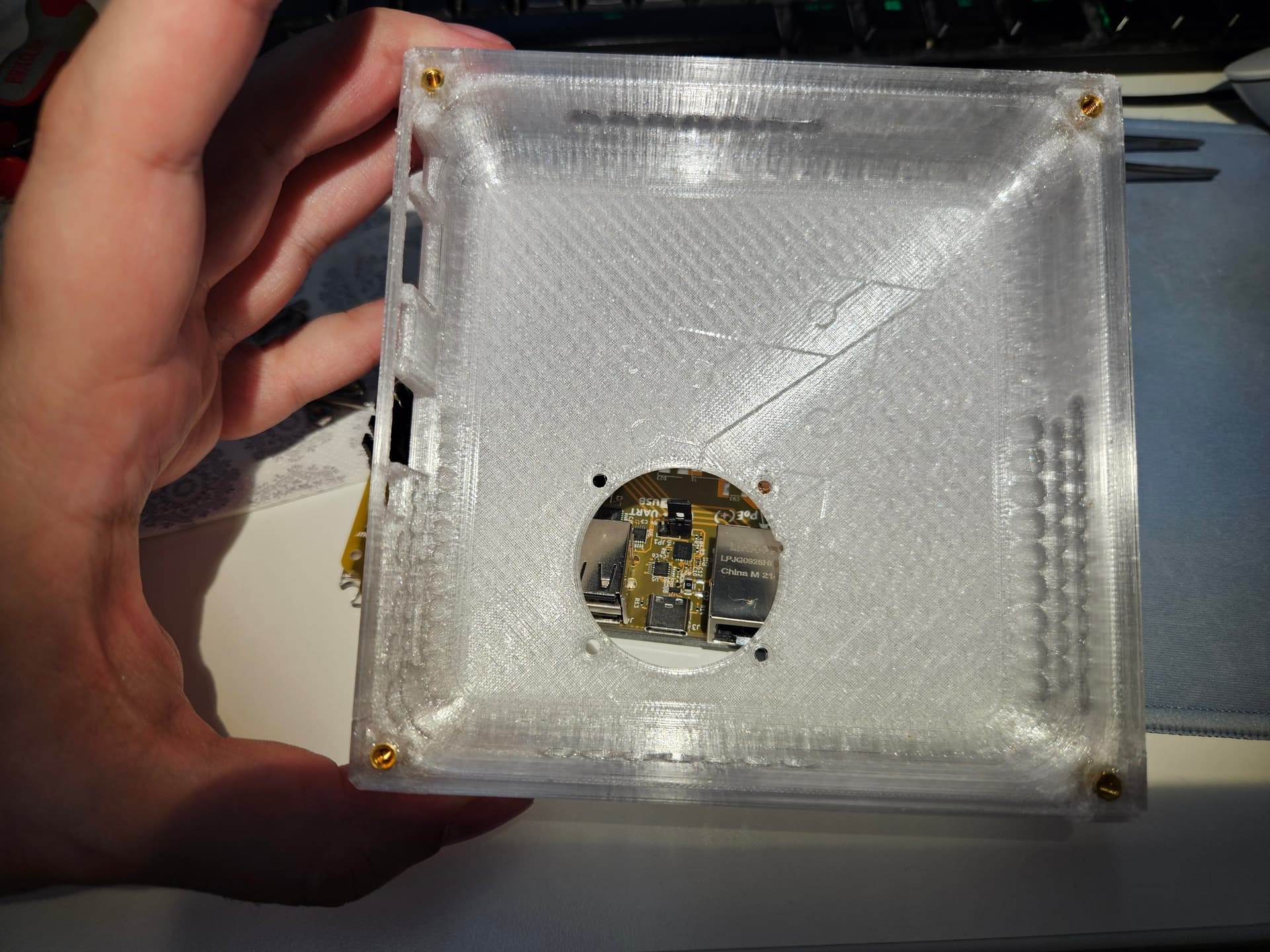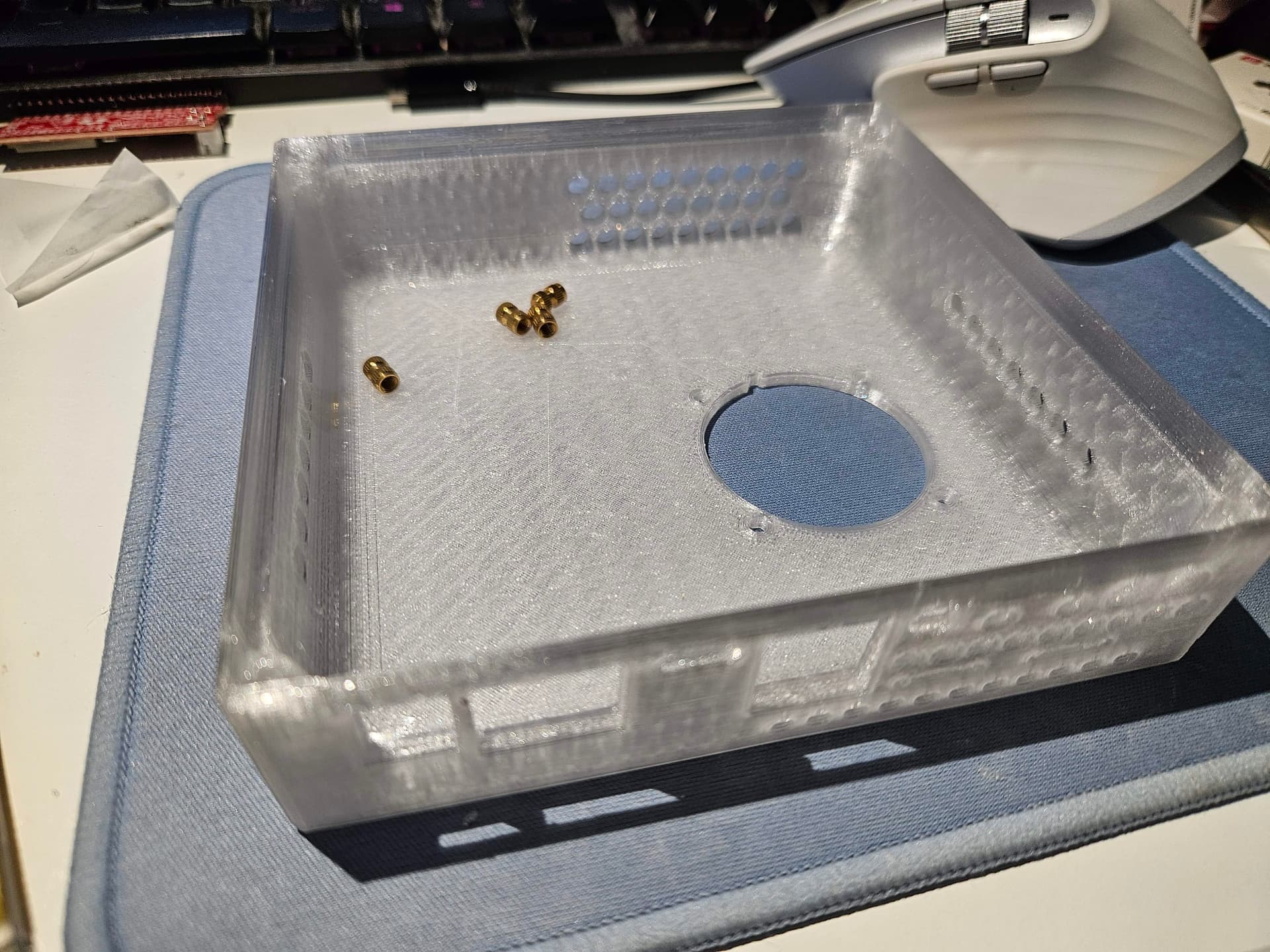 - I 3D printed the top case (with a semi-transparent PETG material to be able to still see the LEDs inside) , added also the heat-set threaded inserts