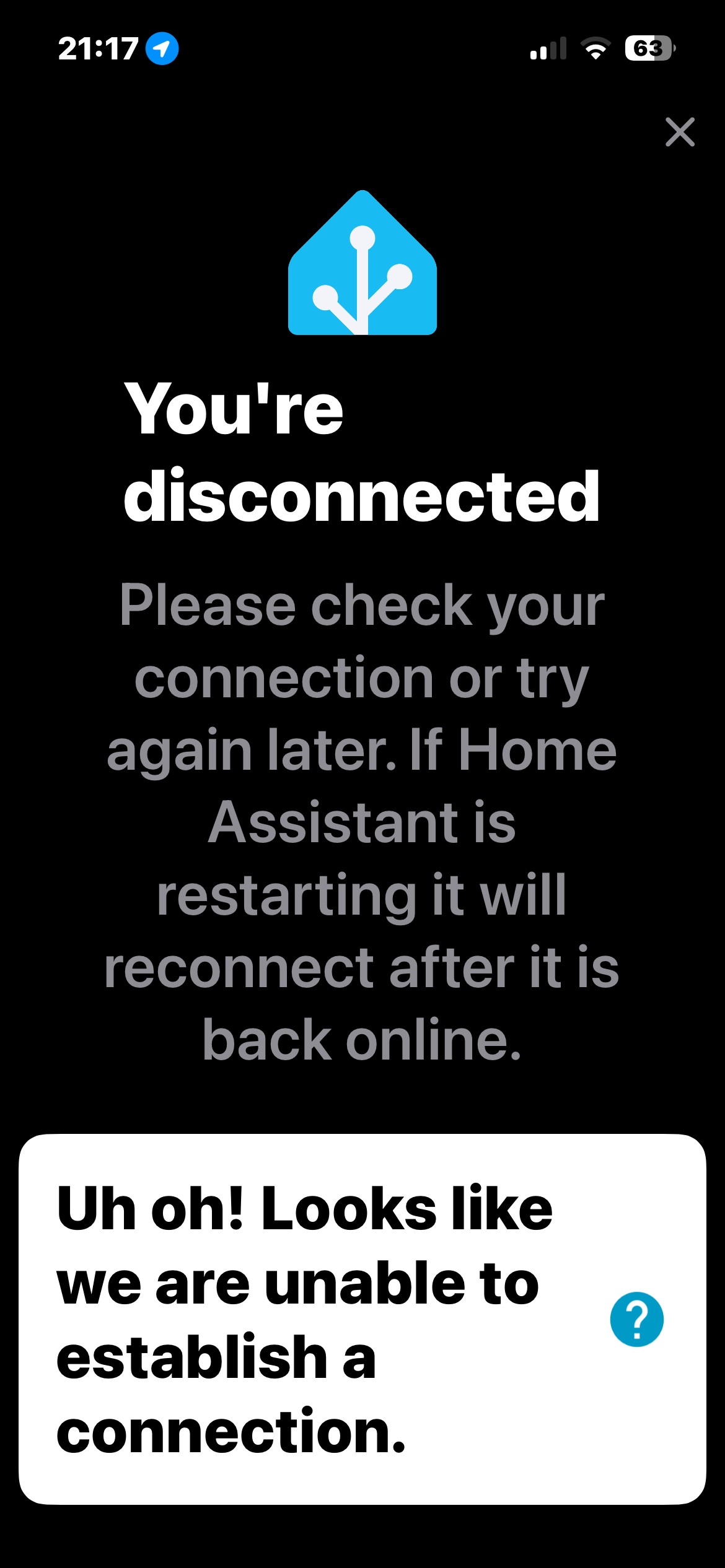 Just started happening tonight. I cannot connect via the app or with Macbook. I’ve tried rebooting the Home Assistant Yellow multiple times. The image is what I get on my iPhone. I’ve no idea where to start. Thanks!