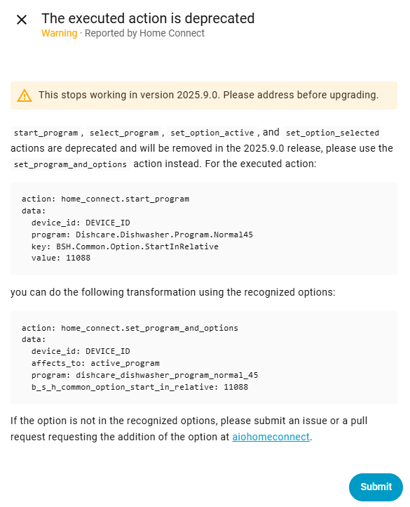 I’ve been getting this deprecated message for a while now and have finally found out how to get the automation to work with the new actions menu for Home Connect.