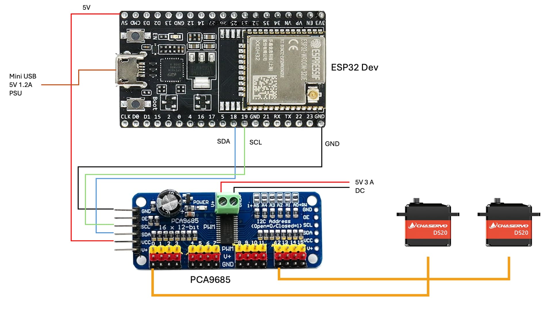 I power the ESP32 with a Mini USB power supply. The ESP32 cannot power the servos directly so I am using a 16 Channel PWM Servo Driver Controller Module I2C PCA9685 12bit to power them. Some people say you can power 1 servo with ESP but I found that not true. My ESP32 crashed every time I tried to run 1 servo directly from it. NOTE: you need to ensure you are supplying the right Ampere for both the ESP32 and PCA9685.