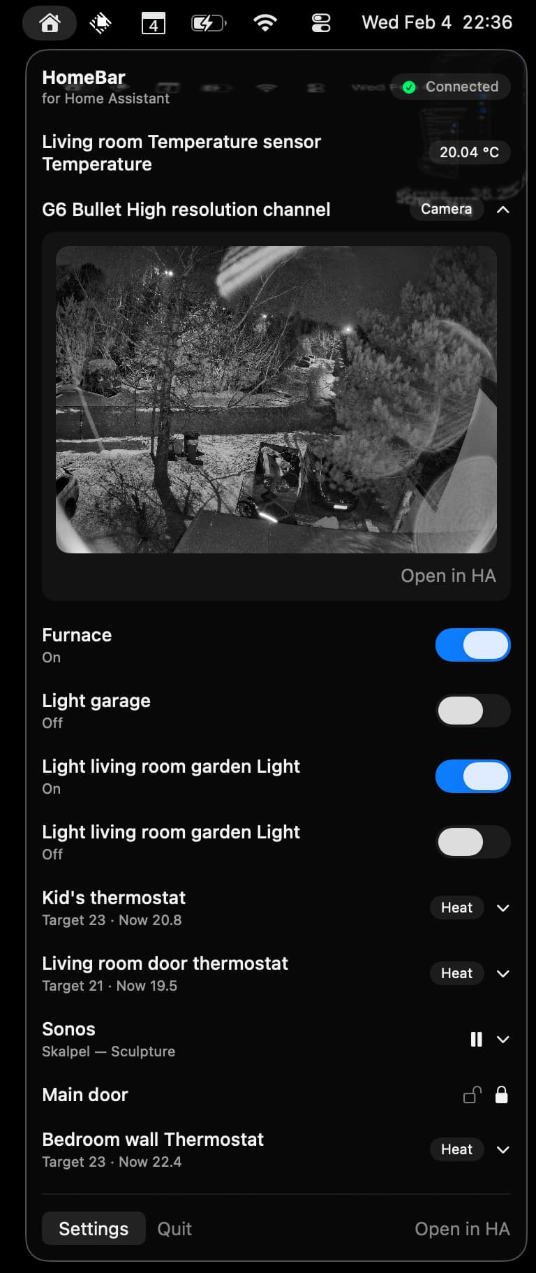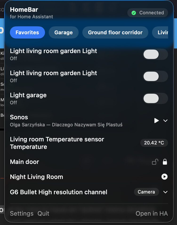 Hi everyone. I’m building HomeBar, a native macOS menu bar app for Home Assistant. I wanted to keep a small set of favorites in the menu bar for quick checks and control. It’s still in development and I’d love feedback.
