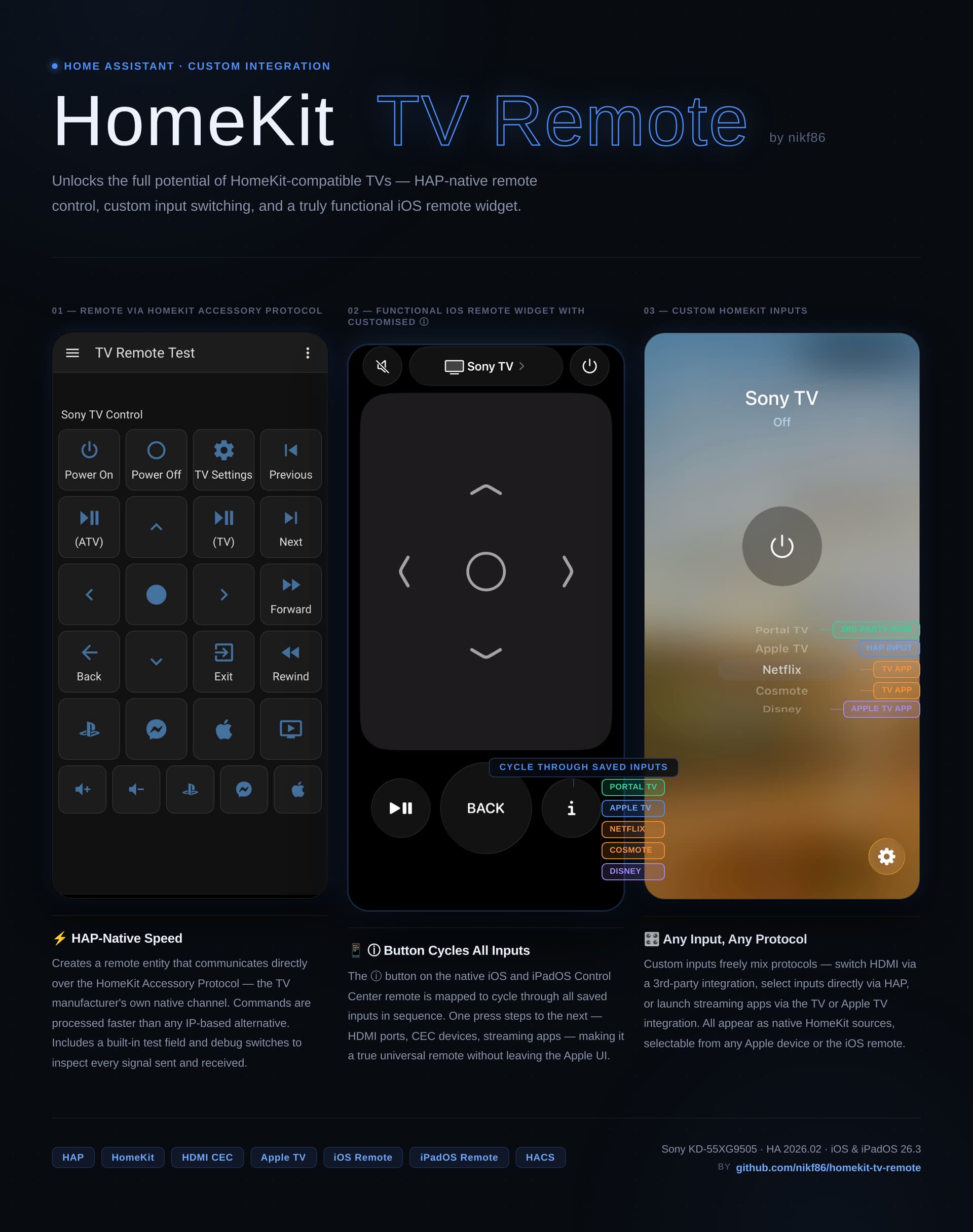 It allows you to create selectable inputs in Homekit based on HAP protocol and 3rd party integrations to set the HDMI input, open apps or practically add any TV command