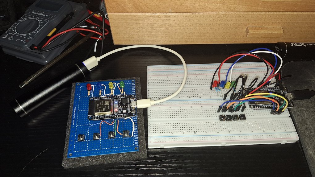 I got some ESP32 development kits and some breadboards. I hooked up some switches and LEDs and started playing with ESPHome. The remote has four push buttons and four LEDs. Each button can generate single, double, and long press events. Button 2 turns a lamp on. Double click turns it on full brightness. Holding button 2 increases brightness. Holding button 1 decreases brightness. Pressing button 1 turns it off. Button 3 toggles an outlet. Button 4 sets away mode.