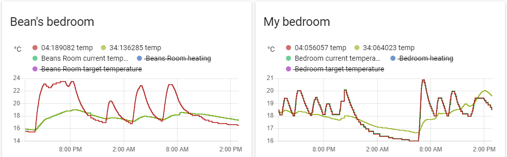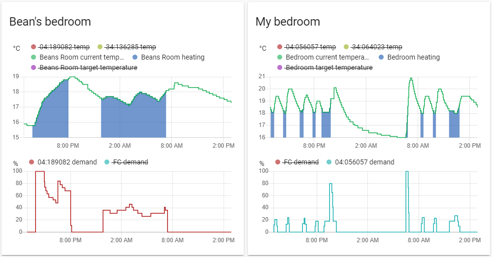The evohome integration shows a shaded are for each zone’s heat demand (upper graphs) - TBH, this is a bit of an educated guess. evhome_rf does it accurately (lower graphs):