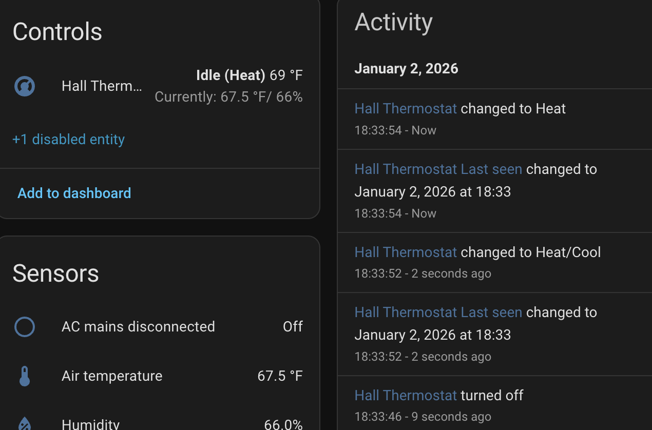 I am not getting state information for my thermostat. I will turn it on at the panel and the app/web says that it’s off and idle. I have to turn it quickly on then off using the app if I want to make sure it’s off. Then I will turn it off at the panel if I turned it on using web/app and the app will say it’s still on heat mode.