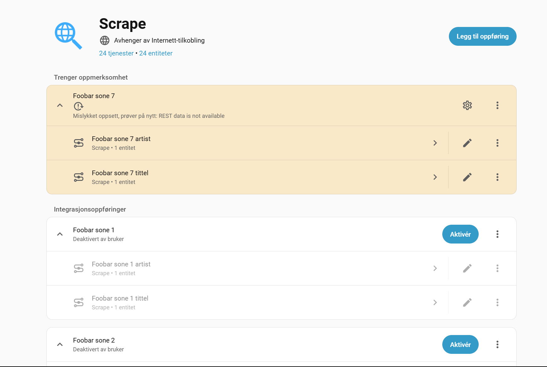 It’s not the media_player.foo, btw. I stopped useing that because it was not possible to deactivate. It does not have a unique ID, and the integration doesn’t support adding one either. So with that I would have 13 zones of foo trying to contact Foobar instances that weren’t running. With Scrape I can activate just the zone that’s running at any given time, if any.