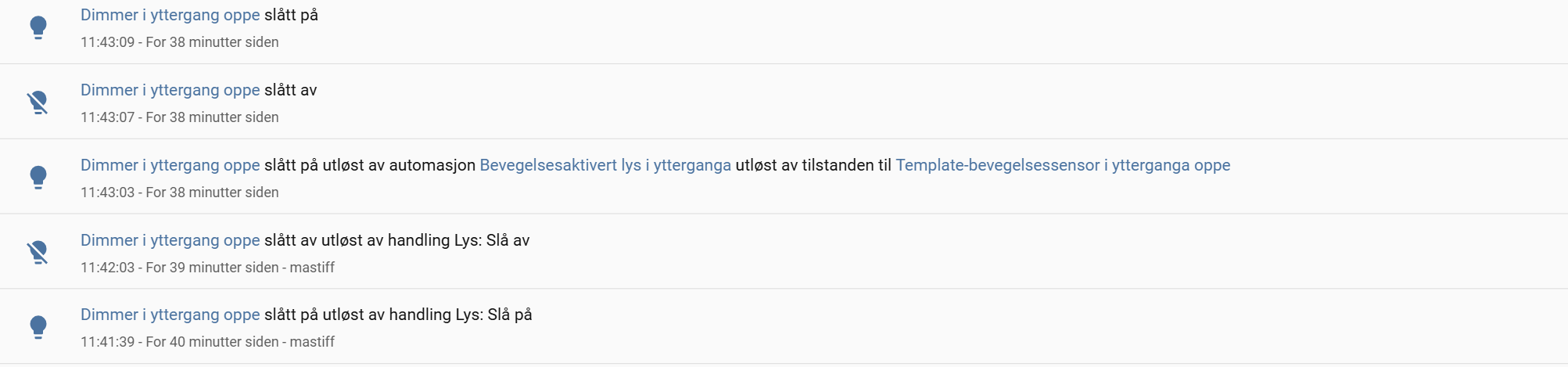 I need to run an automation when a light is turned on or off with the physical button. I see a possibility in the Activity log, I think. Because when I use Hass to turn on and off the light, it says “turned off by action light: turn off”. When the motion sensor light automation is used, it says “turned off triggered by automation motion sensor light”. But when I use the physical dimmer button it just says “turned off”. The same goes for turning on. it’s in Norwegian, but I think it should be understandable. “slått på” means turned on, “slått av” means turned off, and “utløst av” means triggered by: