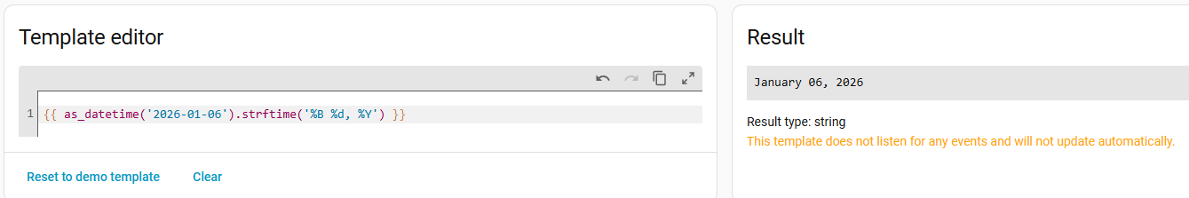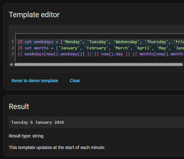 state: "{% set weekdays = ['Lunedì', 'Martedì', 'Mercoledì', 'Giovedì', 'Venerdì', 'Sabato', 'Domenica'] %}{% set months = ['Gennaio', 'Febbraio', 'Marzo', 'Aprile', 'Maggio', 'Giugno', 'Luglio', 'Agosto', 'Settembre', 'Ottobre', 'Novembre', 'Dicembre'] %}{{states('sensor.time')}} {{weekdays[now().weekday()]}} {{now().day}} {{months[now().month-1]}} {{now().year}}"