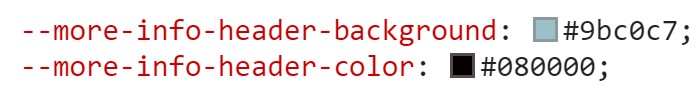 I’ve been trying to change the header of the more info dialog box with no success. I’ve tried more-info-header-background regardless of the color it will not change. However, I can change it directly in chrome by modifying the properties.