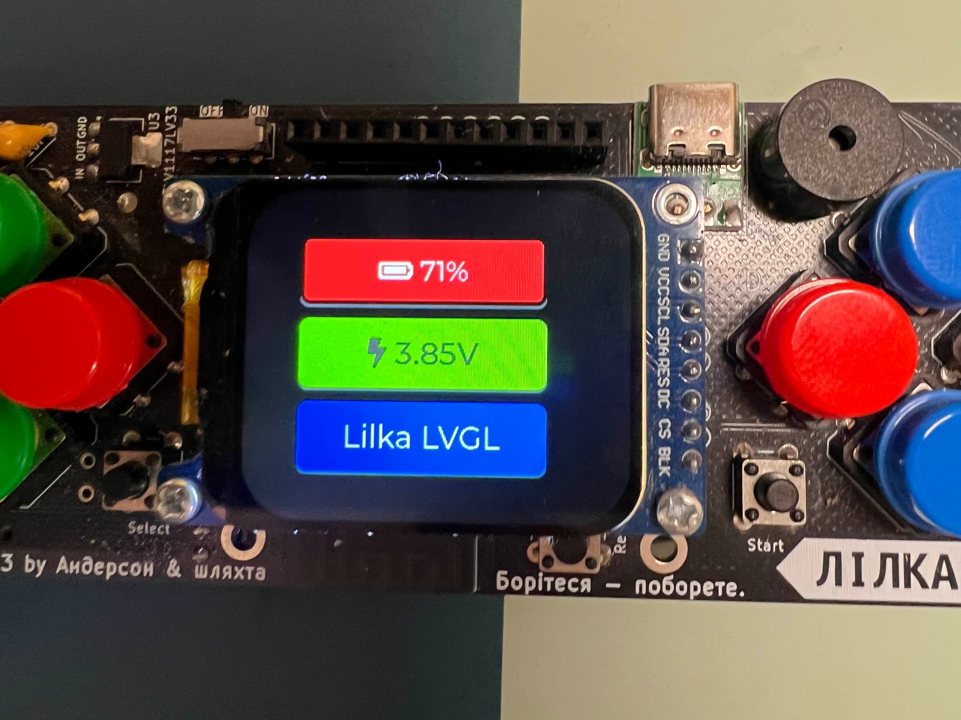 I have this ESPHome configuration for my ESP32 console Lilka. I have three buttons on the screen. They display Voltage, Battery %, and a button with the text Lilka LVGL.