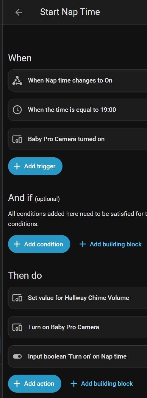 My dashboard has a tile card with a “Nap time” boolean helpeas the entitiy - so this can be used as a single button to start or stop nap time, and reflects if nap time is currently on or not.