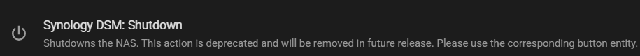 The Synology integration should provide a button as well as that shutdown action (at least until the action is depreciated then it will only be the button). Check the entities available at Settings → Devices & Services → Synology. There should be a shutdown button there.