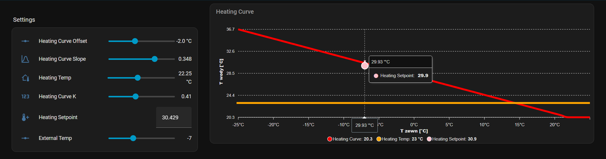 Total newbie here and would really appreciate some help. I’ve tried the code in the thread but can’t get it to work for me. I want the graph to show the my weather compensation of my heat pump. I have the x1-4 (ambient temp) and y1-4 (flow temp) values, as ‘editable’ climate’s (e.g. climate.ecomode_flow_temp_y1). Can anyone assist please. Ideally i would like the 8 sliders values at the top and the corrsponding graph below. Unless anyone has any better ideas. Many thanks