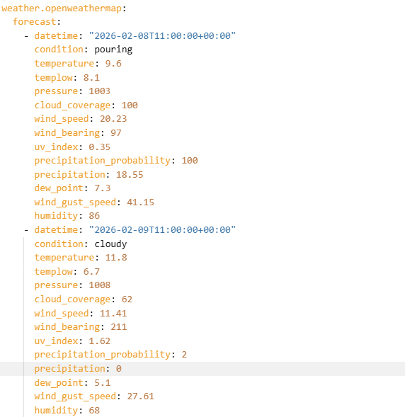 I’ve currently got the Google Weather integration working and when I go into the integration and click on the Home sensor it will give me a very thorough forecast that has min/max daily, twice daily and hourly. This is exactly what I’m looking to use, but I can only find a singular temperature entity. Any idea how to reference these min/max values?
