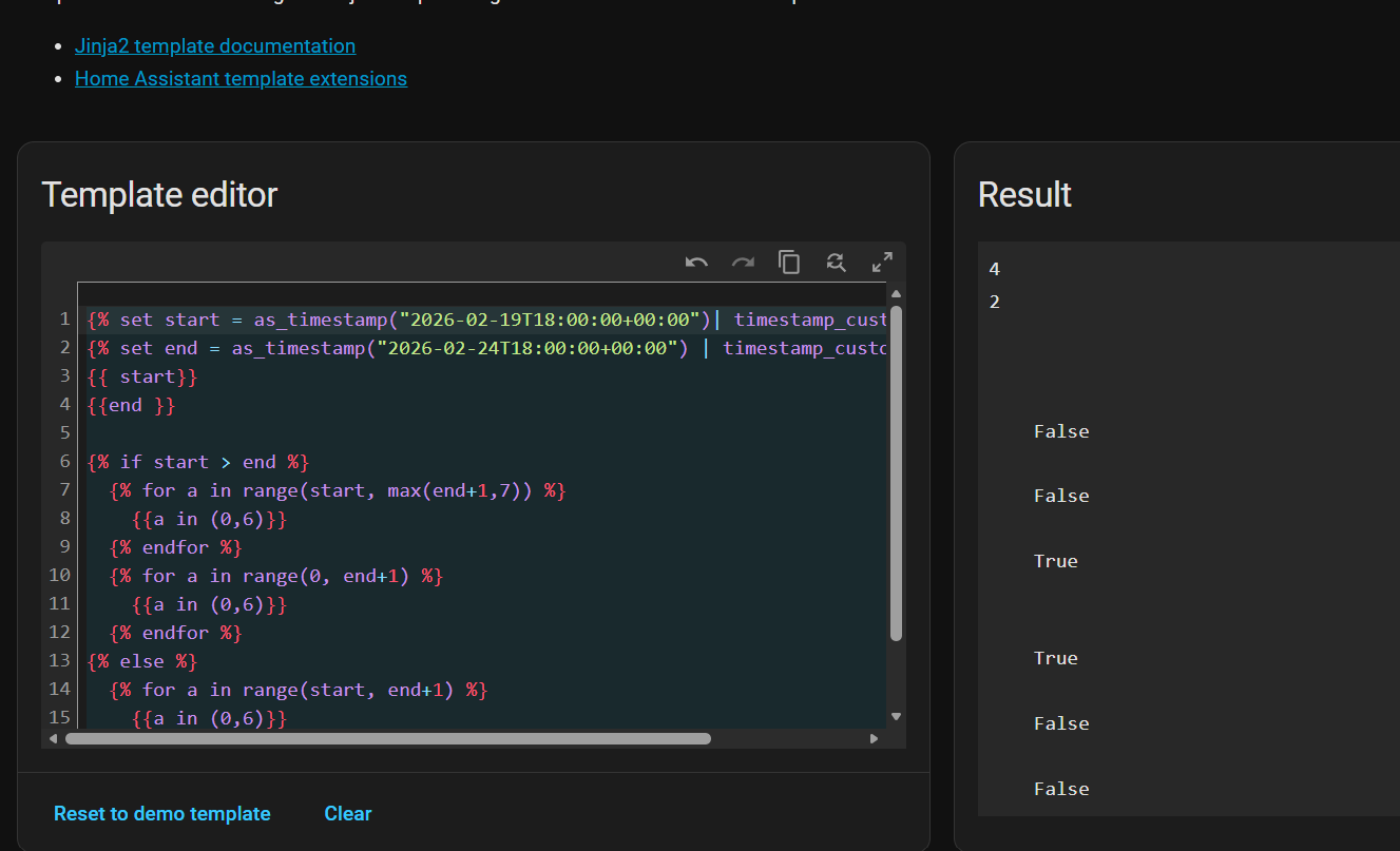 {% set start = as_timestamp("2026-02-19T18:00:00+00:00")| timestamp_custom('%w') | int %}