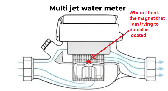 If I am reading the datasheet correctly, it looks like it is designed to detect metal up to 4mm away. I am not sure how it is supposed to make the distinction between the metal of the enclosure and the metal of the impeller’s magnet. And I estimate that the magnet is 3-5cm away from casing, inside of the meter (diameter of the meter / 2), so that’s too far for that sensor.