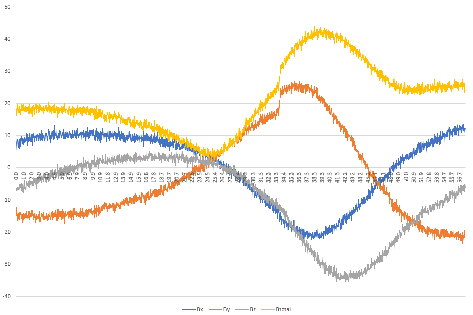 I have some more data to share with all of you. While I’m waiting to receive some sensor parts, I installed an app called Physics Toolbox Suite on my S25 and used it to record the magnetic field next to the Neovac water meter while a bath was being drawn.