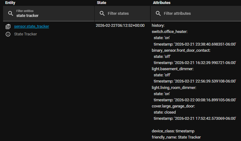 As a bit of a challenge and because I was interested myself, I created a single template sensor that can record the “last changed” timestamp of any entity that you apply a label of “State Tracker” to. Here is what that template sensor is. Since this is a trigger-based template sensor, you have to place this in your configuration.yaml, or your templates.yaml or however you have your config split up: