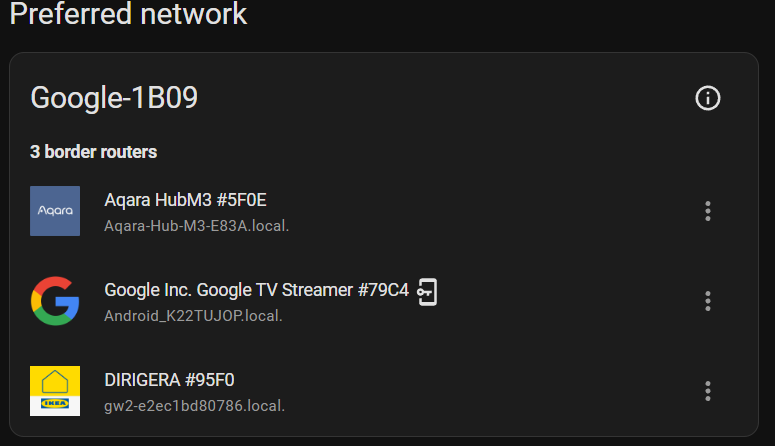 As soon as you’ve added a Matter device using the IKEA app, DIRIGERA creates it’s credentials and seems to overwrite what Android has used so far, or Android prefers Thread v1.4 networks. When this happens you’re pretty much doomed if you want to use the HA network. Again, DIRIGERA never auto-joined the HA preferred network, I never got a (i) icon.