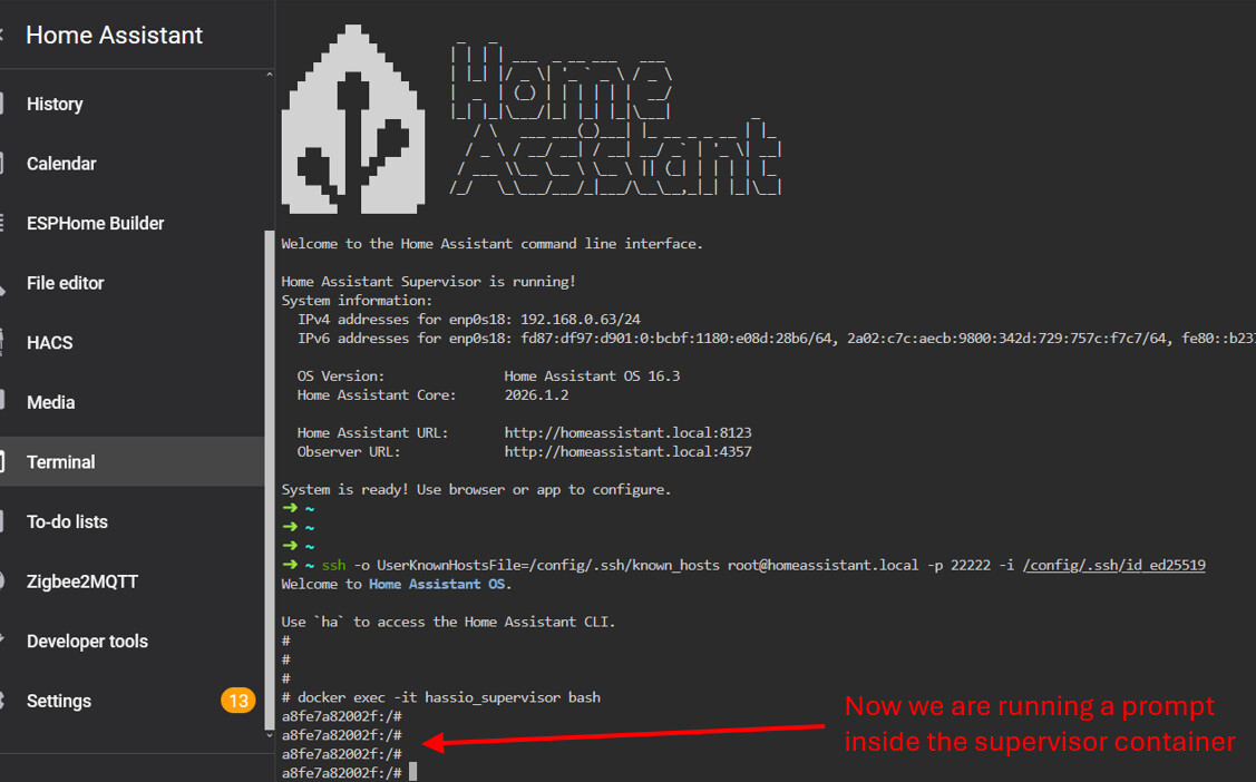 This first shell script then enters the Supervisor docker container and executes a second script inside (