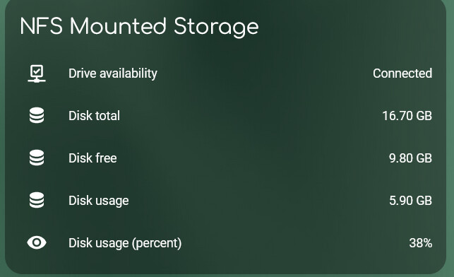 My first thought was to just use the System Monitor integration. However, when using Home Assistant OS, the System Monitor integration runs inside the homeassistant docker container, but the NFS mounts are not passed through into that container. Instead it seems the NFS drives are passed into the Supervisor container (called hassio_supervisor), because this is the one that handles network mounts and backups, etc. Therefore the System Monitor integration cannot see NFS mounts.