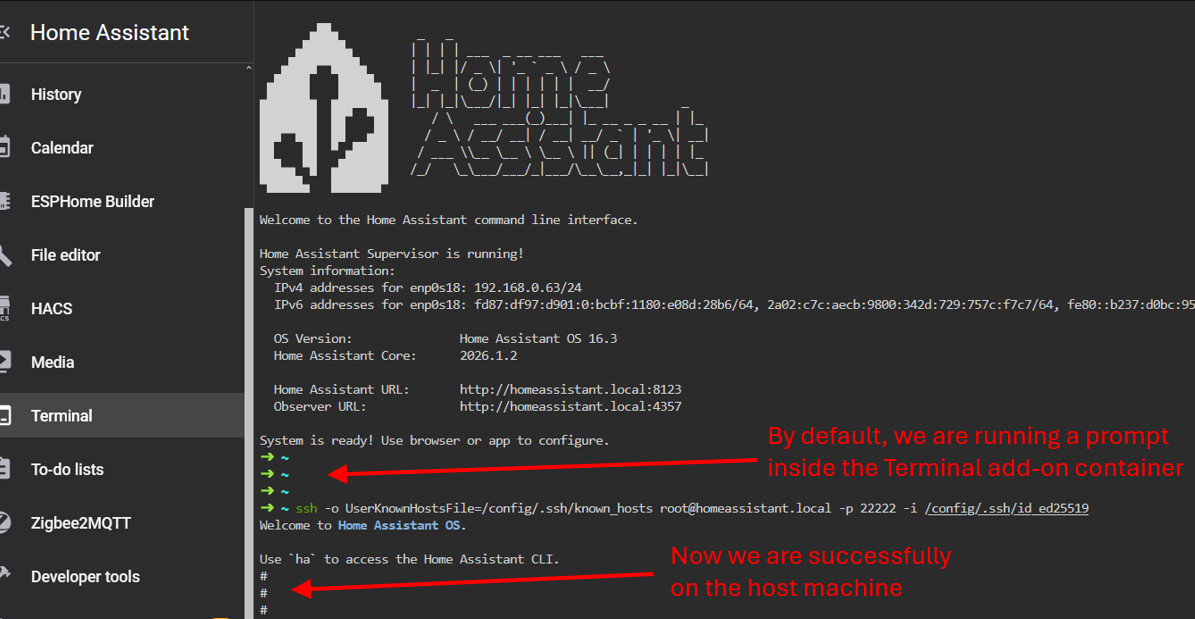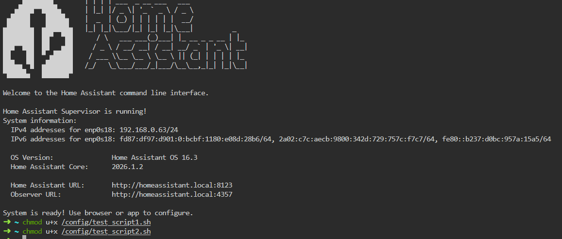 The first script is a basic Bourne shell script, because it seems Bash is fully not available on the Home Assistant OS host. Therefore it doesn’t have access to nice features of Bash (such as arrays), which would have been useful. However, it seems that Bash is installed in the Supervisor container image, and so the second script is a Bash script.