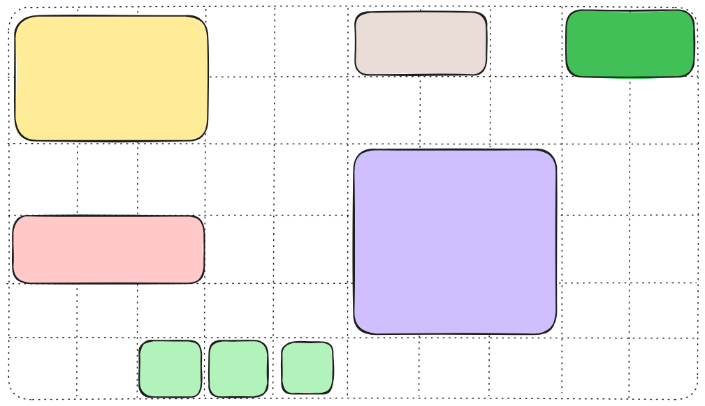 You can easily accomplish this using custom layout card: thomasloven/lovelace-layout-card: Get more control over the placement of lovelace cards. and using it in grid mode and for best result put in dashboard defined as panel (to occupy entire screen real estate). Then you simply define grid (in your case 10x6), name properly grid cells and assign these cells to your card by defined name. Cards are placed within custom layour card. So code would look like: