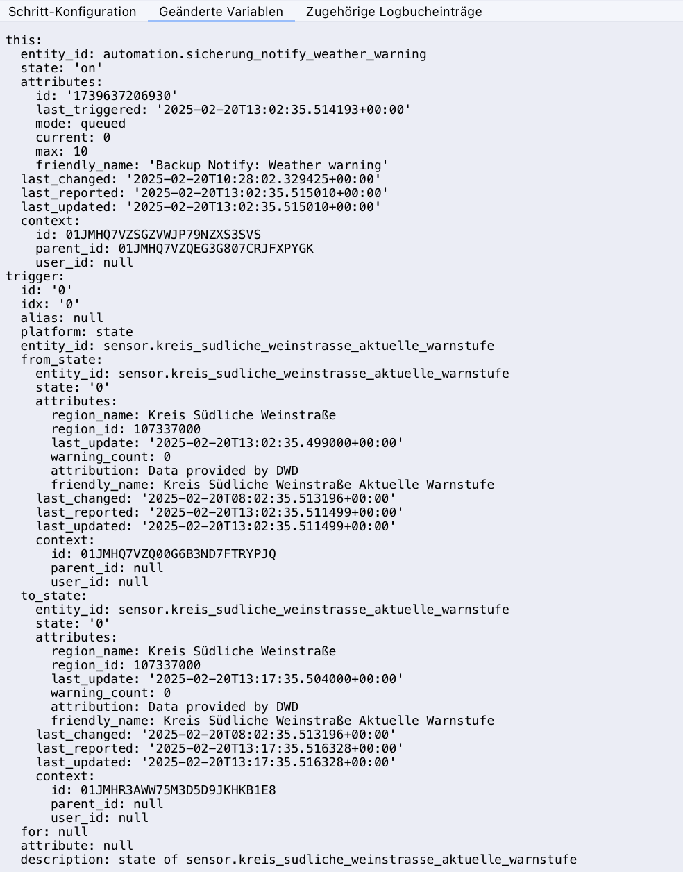 I think you misunderstood, when I said before and afte state. I was thinking about “Changed Variables” or “Geänderte Variablen”, next to the “Step config” or in German “Schritt-Konfiguration” when you enter the trace of the automation.