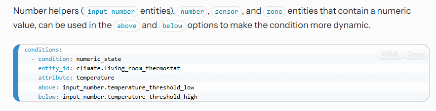My thermostat entity id is ‘climate.upstairs’. If the target temperature were 19, I’d like to set that as the below threshold to turn on the switch for the heater, and if it goes above 19 + 1, I’d like to turn off the switch.