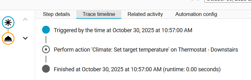 The trace looked normal (shown below) and I found no errors in the log. Also, these devices are pulled into HA by the Hubitat Integration. So I disabled the downstairs thermostat and also the thermostat controller in Hubitat, but the temperature still did not change when I ran the automation.