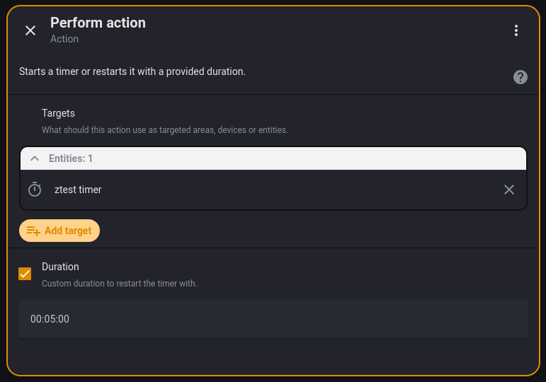 I think what you may be missing is that you need to create a Timer entity in the Helper menu first. The timer actions like timer.start that are found in the Automation editor require a Timer entity to act on. Once that is done, you just select the Timer under Target, check the “duration” box, and type in the duration: