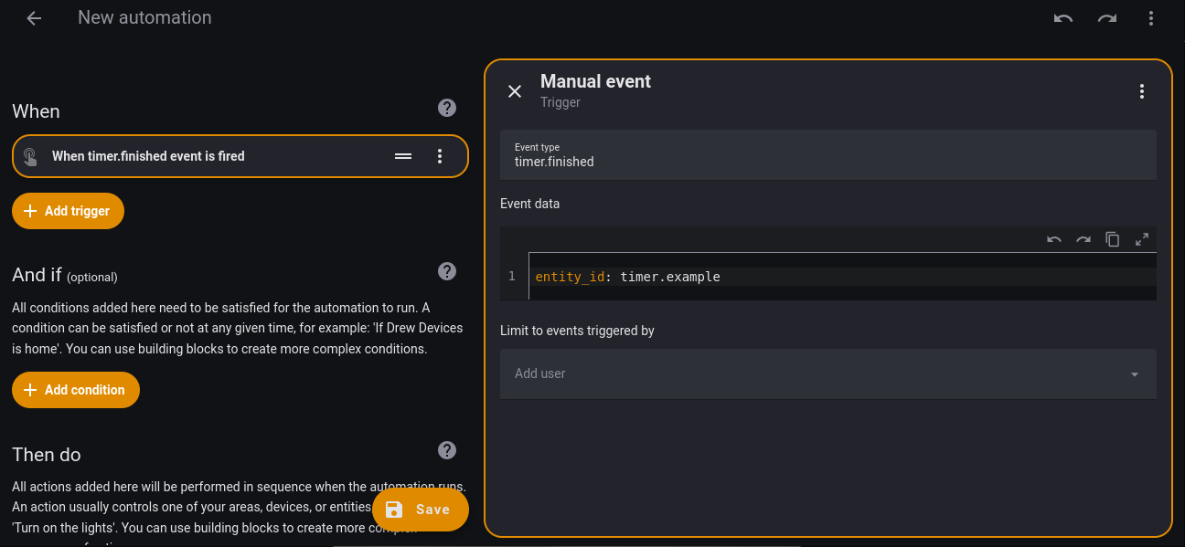 To trigger off a Timer, you will need to select “Manual Event” from the trigger options and fill in a little bit of information including the entity ID of the Time helper you created for this automation: