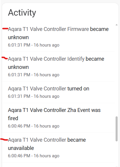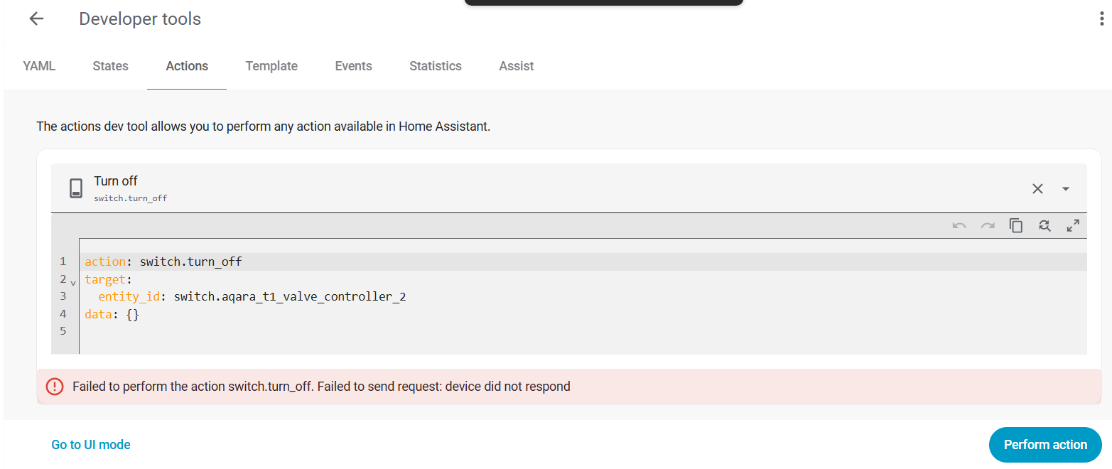 I have an Aqara T1 valve controller that occasionally becomes unresponsive. I can see in the device “Actions” that the state is unknown and sometimes unavailable. Also, in Developer Tools I ran an action and got the “Device did not respond” error shown below.