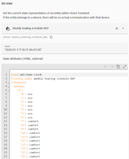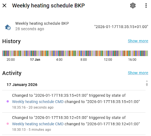 In the âWeekly heating schedule BKPâ entity, we can see that the schedule data is copied from the âWeekly heating schedule CMDâ entity when the latter changes state.