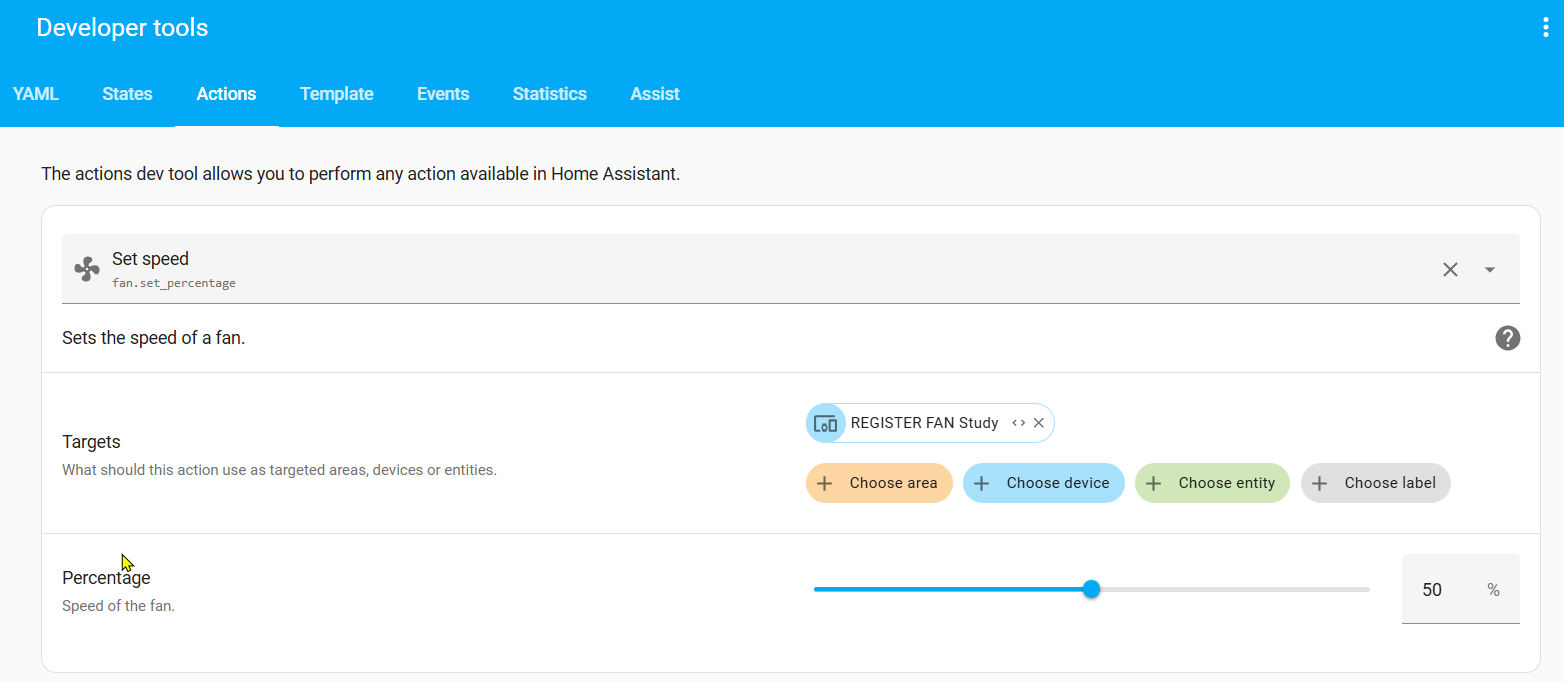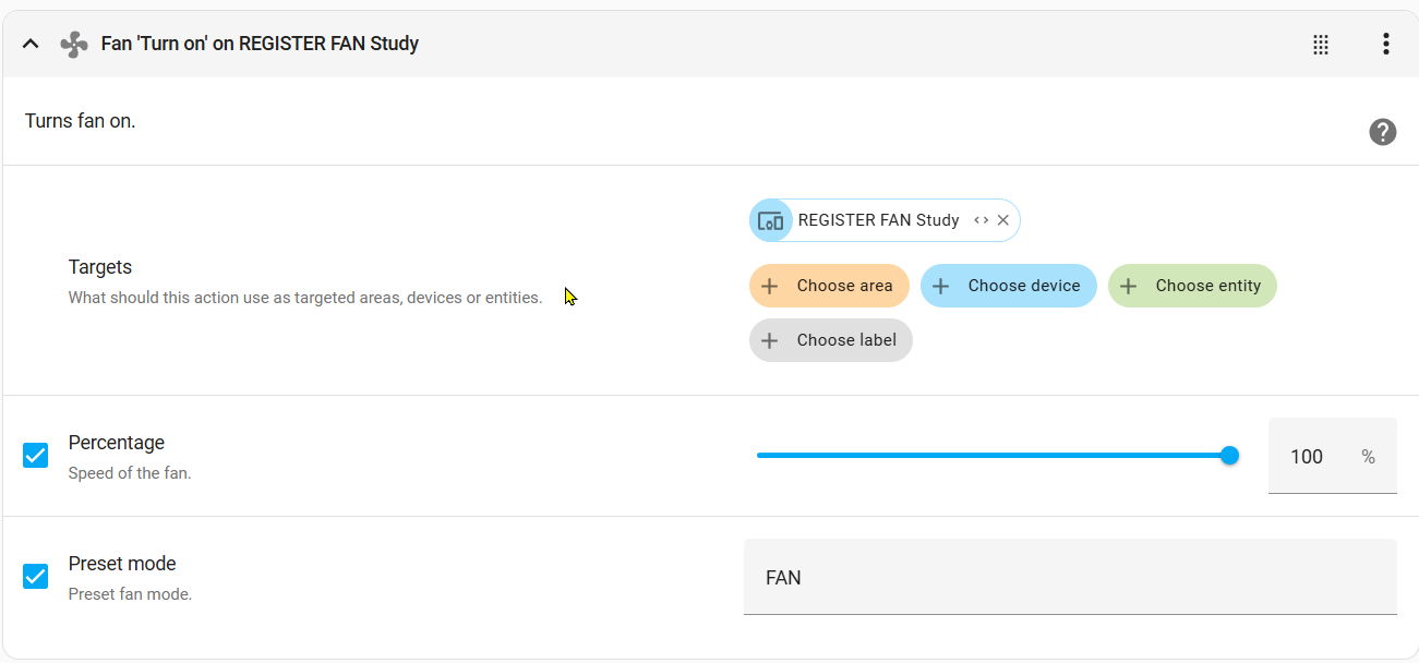 I tried creating an automation with it, but unfortunately the only part of the automation that works is to turn on the device. It ignores any mode and/or percentage setting. Screen shots of the automation (in UI and yaml below)