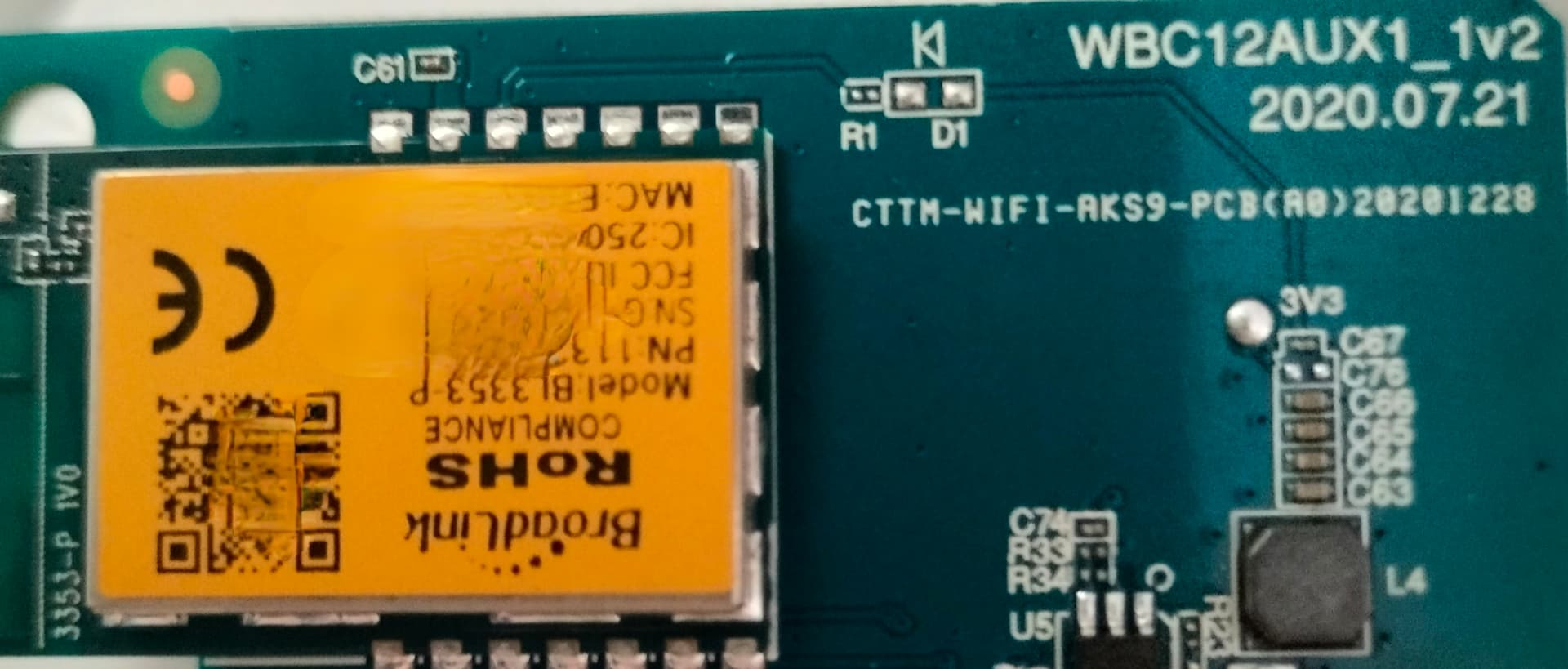 First of all, I opened it and I realize it has no USB port so I couldn’t try an ESPhome solution, like in another Midea A/C I have. This HTW A/C has a BroadLink BL3335P Wi-Fi module mounted on a custom PCB (WBC12AUX1_1v2).