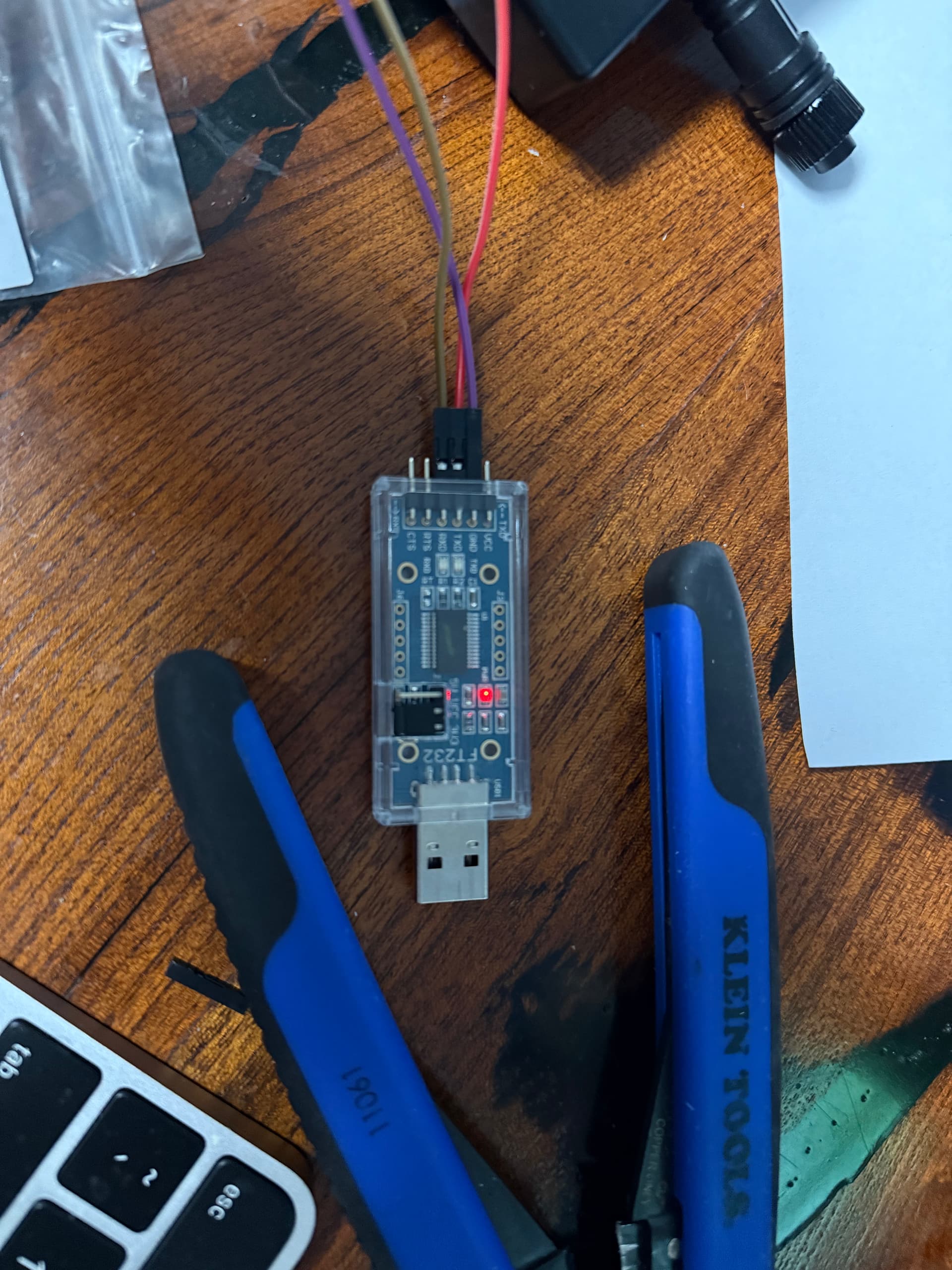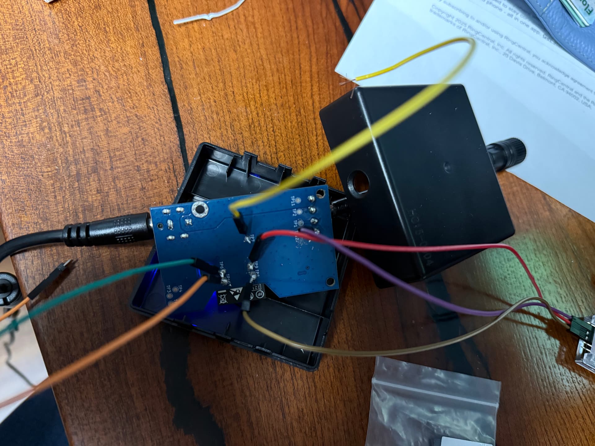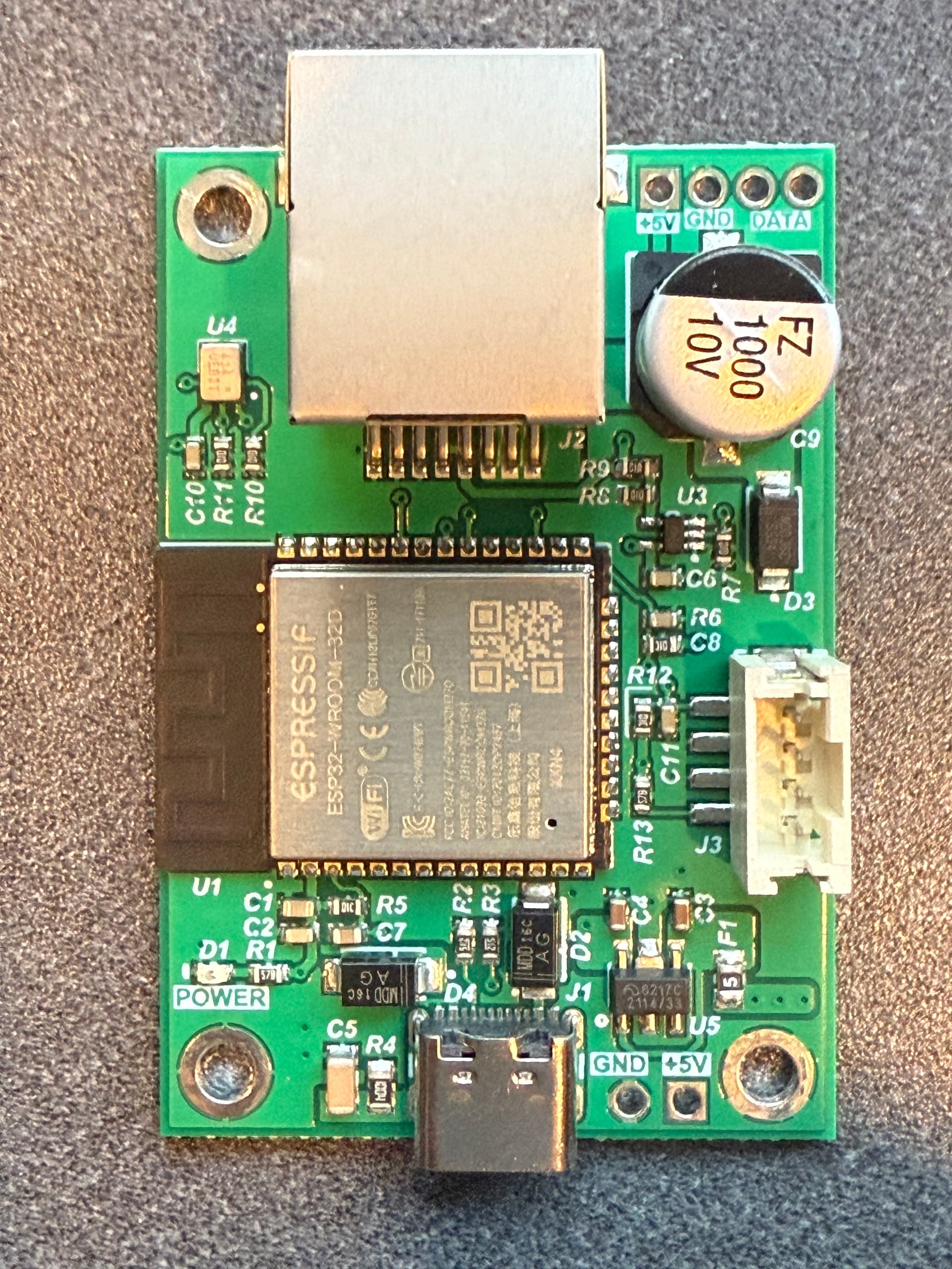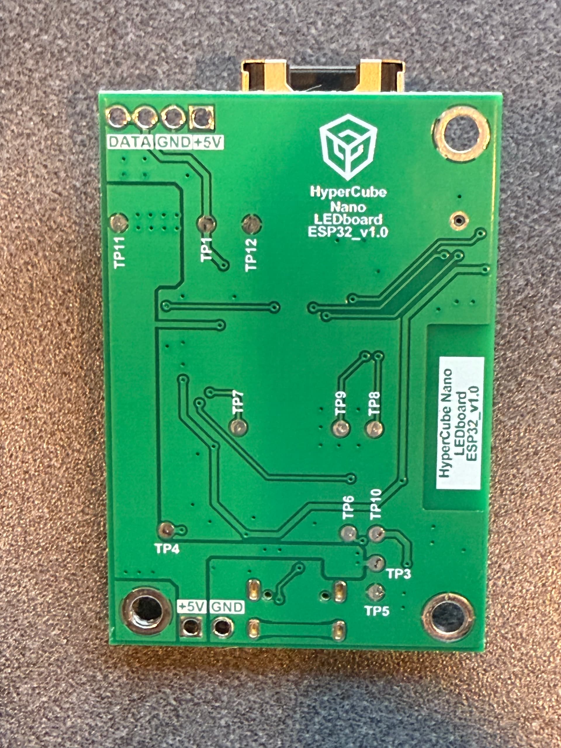 The board has a set of test pads on the PCB that act as the programming pins. On my version of the board the mapping was: TP7 is the BOOT pin (IO0), TP8 is RXD, TP9 is TXD, and TP10/TP12 are ground. I used a USB-to-UART adapter (set for 3.3V logic) and connected TX from the adapter to TP8, RX to TP9, and GND to TP12. You don’t connect the adapter’s 3V3 or VCC line, since the board already powers itself through the 15V barrel jack. It also helps to unplug the LED strips while flashing so the ESP32 doesn’t brown out.